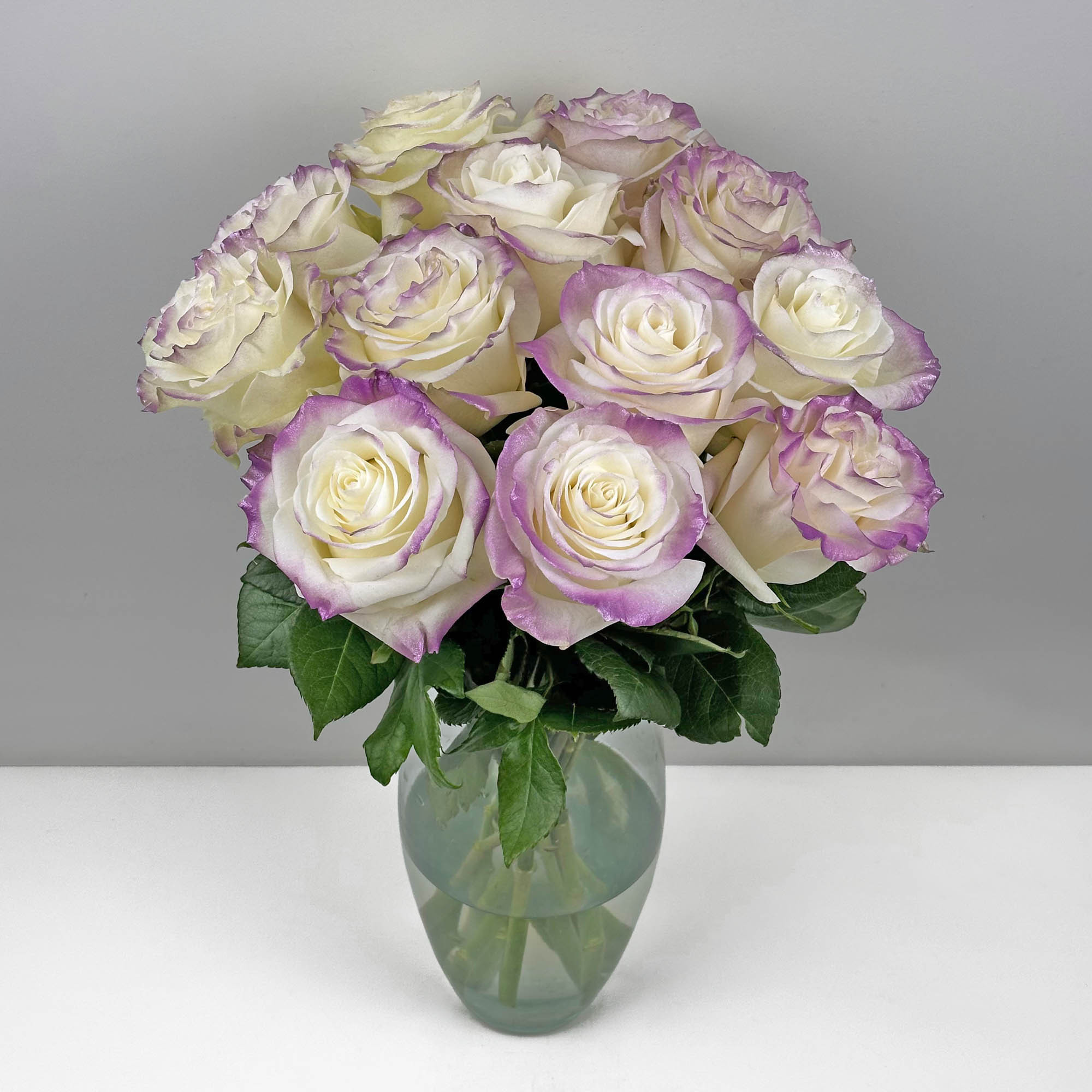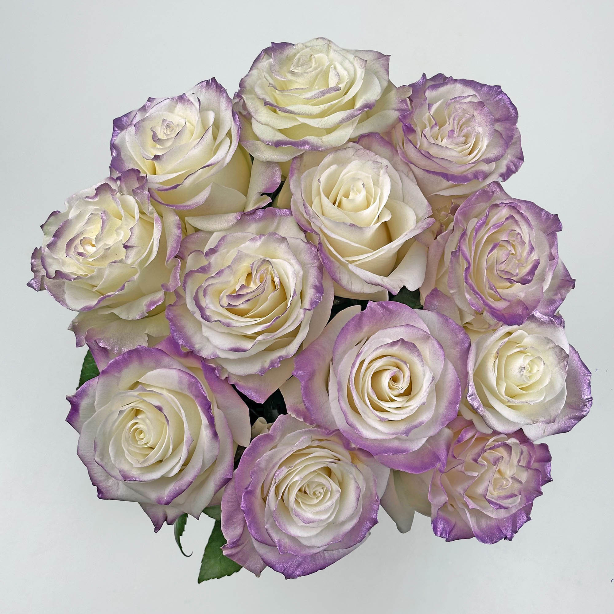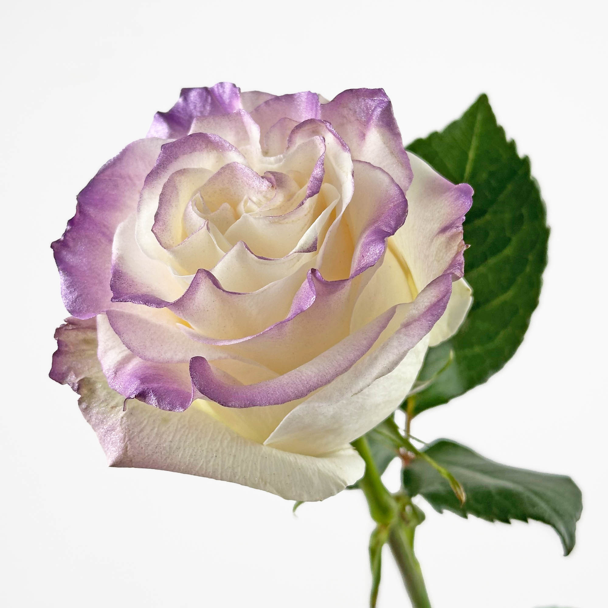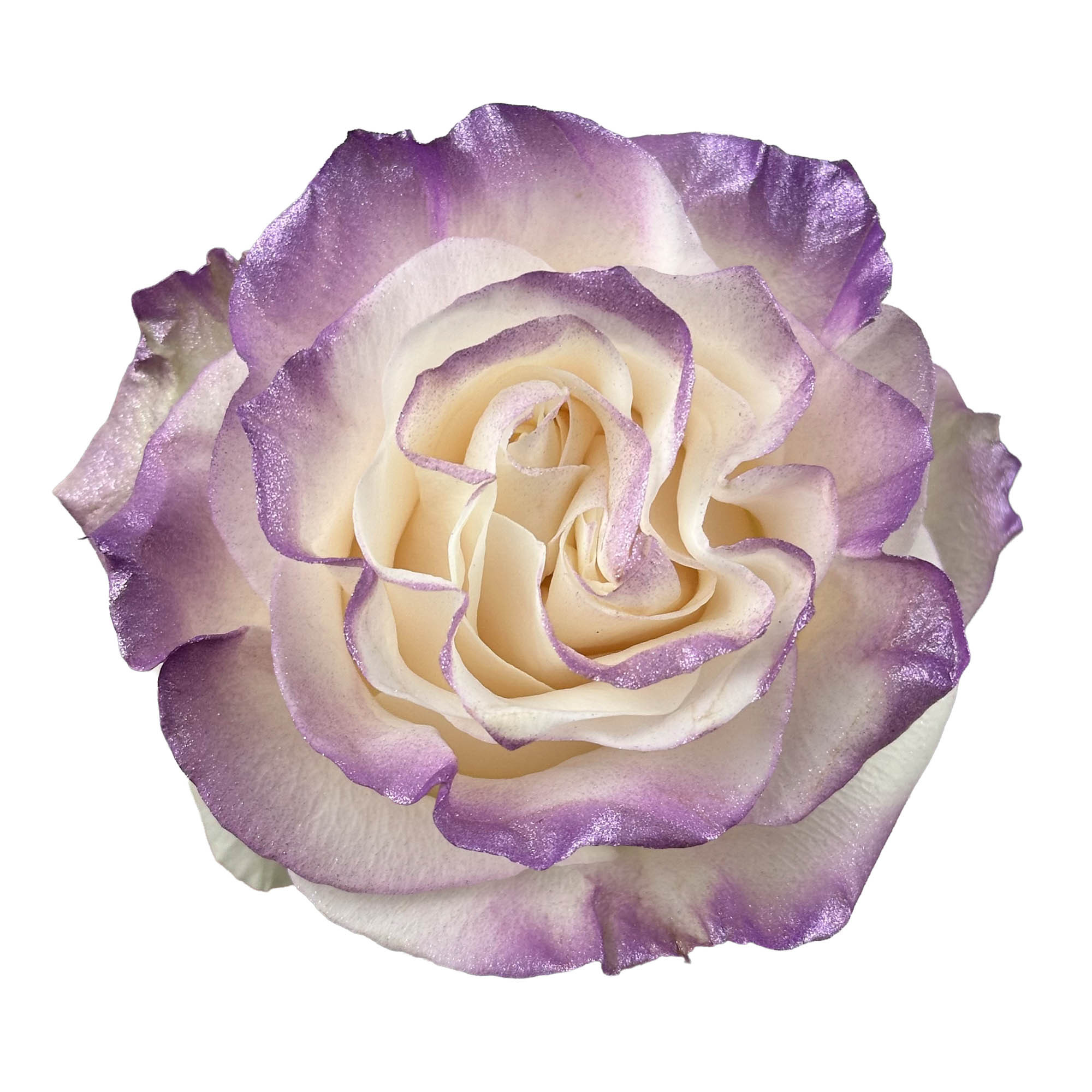 Dyed rose, 40–50cm. White base with lavender/purple petal edges. Ecuadorian-grown, packed per bunch.