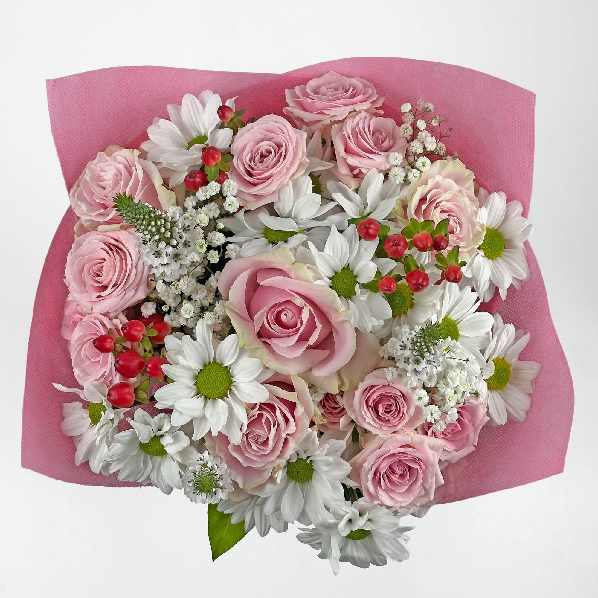 Pre-made mixed bouquet, 25 stems, 40cm. Pink roses, white daisies, hypericum berries, and white fillers. 8 bouquets per box (QB). Ecuadorian-grown.